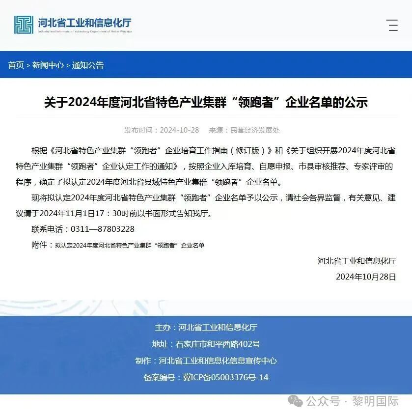 副理事长单位动态 | 黎明国际 荣登 2024 年度河北省特色产业集群 “领跑者” 企业名单